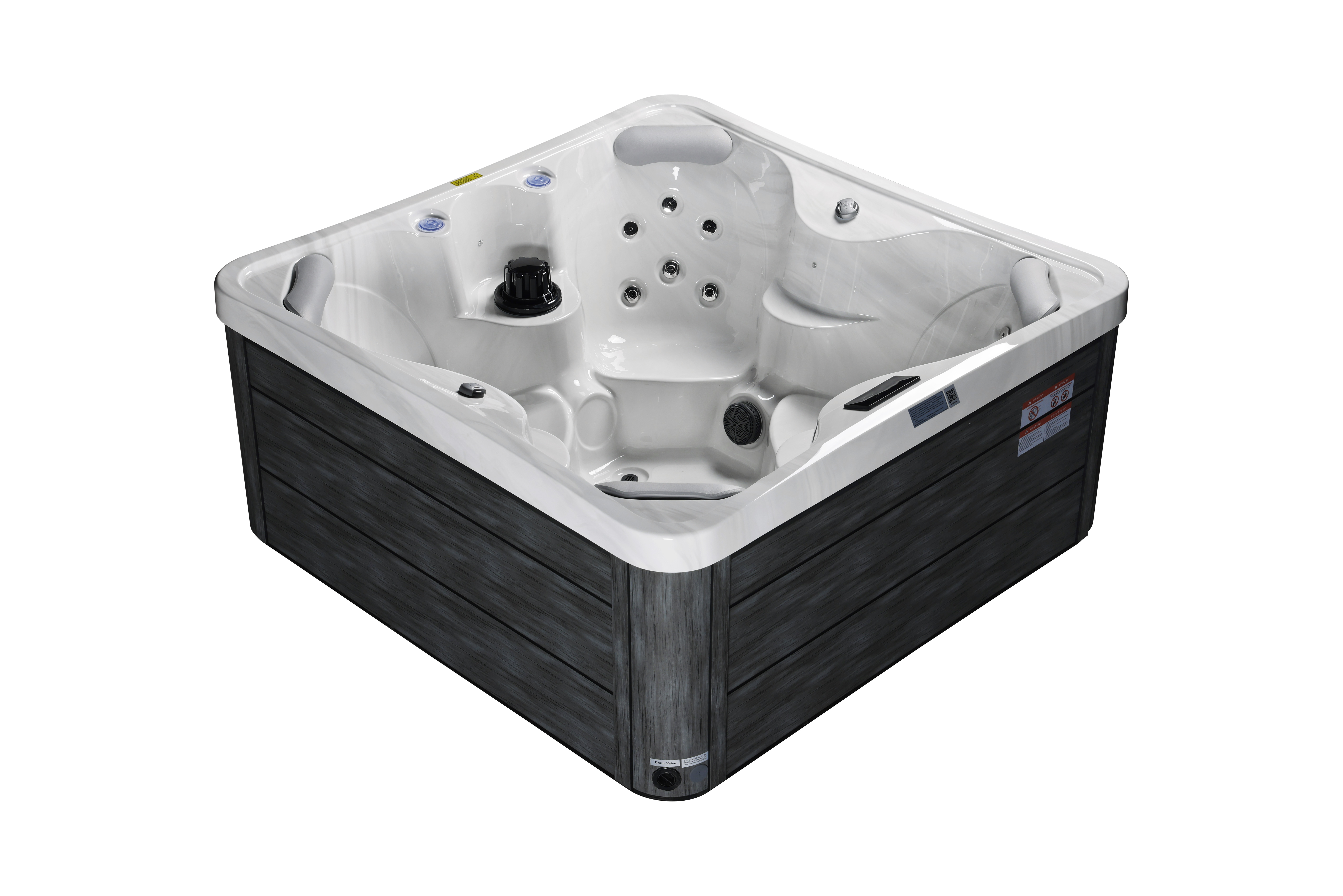 NordicSpa Nyerd с размером чаши 1,8 x 1,8 м идеально подходит для установки как в помещении, так и на улице. Компактная квадратная форма с четырьмя эргономичными подголовниками комфортно вмещает до четырех человек, создавая уютную атмосферу для отдыха и общения.