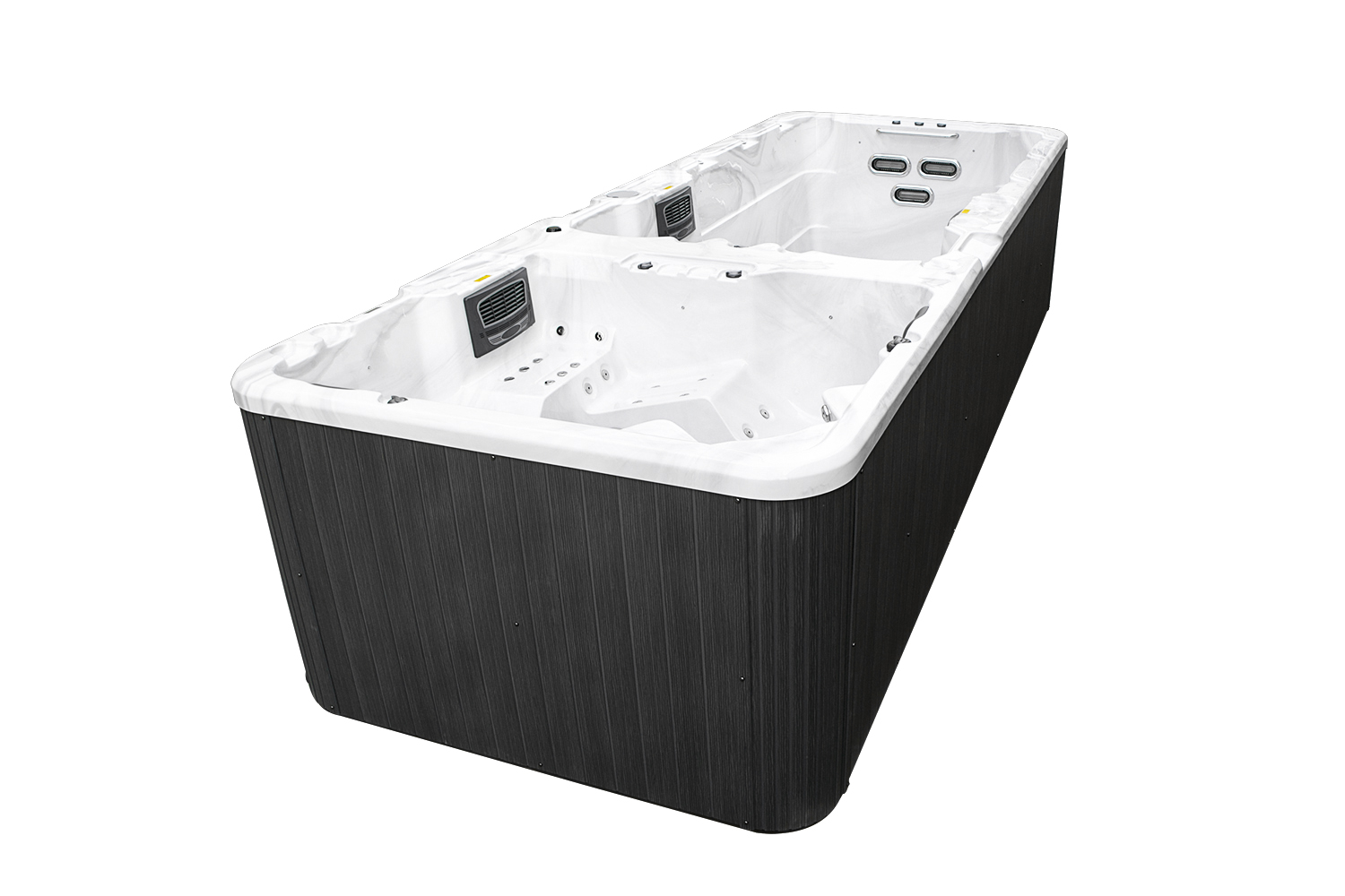 Четыре мощных насоса (два по 2,2 кВт и два по 1,5 кВт) работают в разных зонах, обеспечивая интенсивный массаж 62 форсунками. Продуманная конфигурация гарантирует эффективное воздействие на все группы мышц и создает оптимальные условия для плавания.